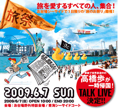 - 【詳細】 旅祭 −World Journey Festa'09− 【日時】2009年6月7日(日) 10:00~20:00 【会場】お台場野外特設会場/青海シーサイドコート(東京都江東区青海2丁目) 【入場料】前売 4,000円(旅祭オフィシャルグッズ付)/当日4,500円 ※前売券が完売した場合、当日券の販売はありません。 ※当日券には、オフィシャルグッズは付きません。 ※小学生以下の方は保護者同伴にて無料でご入場いただけます。(中学生よりご料金をいただきます。)