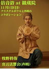 会 場:観蔵院本堂 東京都練馬区南田中4-15-24 ☎03-3996-6858 日 程:11月1日(日) 時 間:開場16:00 開演16:30 演 奏:牧野持侑(アルケミークリスタルボウル)+真言法響会(声明) 案内人:倍音エムカワ(千石空房) 料 金:前売¥3,500(税込) 当日¥4,000(税込) 問合せ:0463-26-6671 ㈱ピンポイント チケットはインターネット