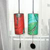 上部についた紐(ヒモ)をもってチャイムを振ると、チャイムの中の振り子が正確に調律された8つ銀柱にあたり美しい和音を奏でます。玄関にかけておくと人の出入りのたびに癒されます。うちの愛犬ボンは “鳴らせ鳴らせ” とうるさいです。相当気に入ってる模様。